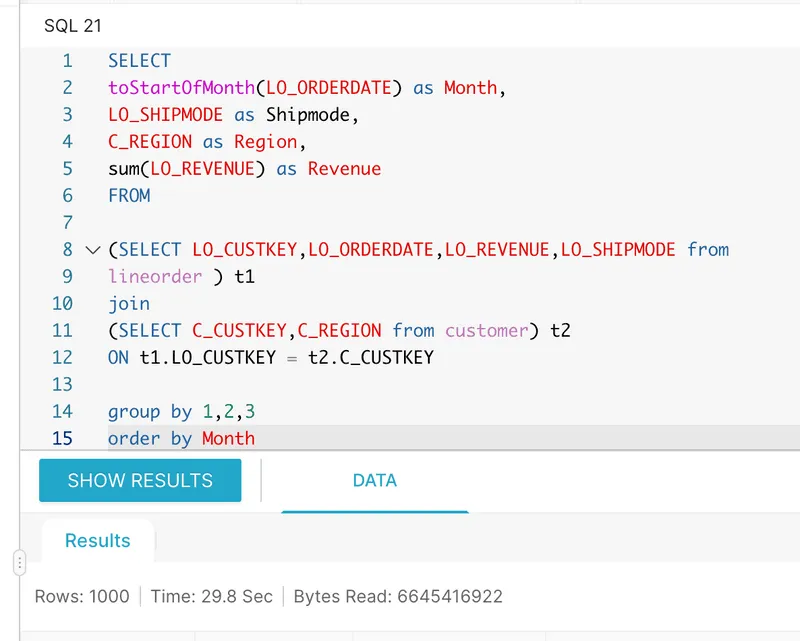 You can use the same approach in more complex situations to improve query speeds, boost system performance, and save on RAM. If you're interested in learning about different methods of speeding up queries in Clickhouse and solve memory errors, read more on this link: